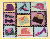 Make this fun, easy wall quilt top based on Karen's pattern for Jen's Closet quilt as seen in her book "Fast, Fun and Easy Fabric Flowers." This project goes together like a breeze with the easy-to follow pattern. Then you add your personal touch by embellishing the purses, hats and shoes with fabric flowers of your own design. Tack on a few buttons and trims and it's ready to admire. |